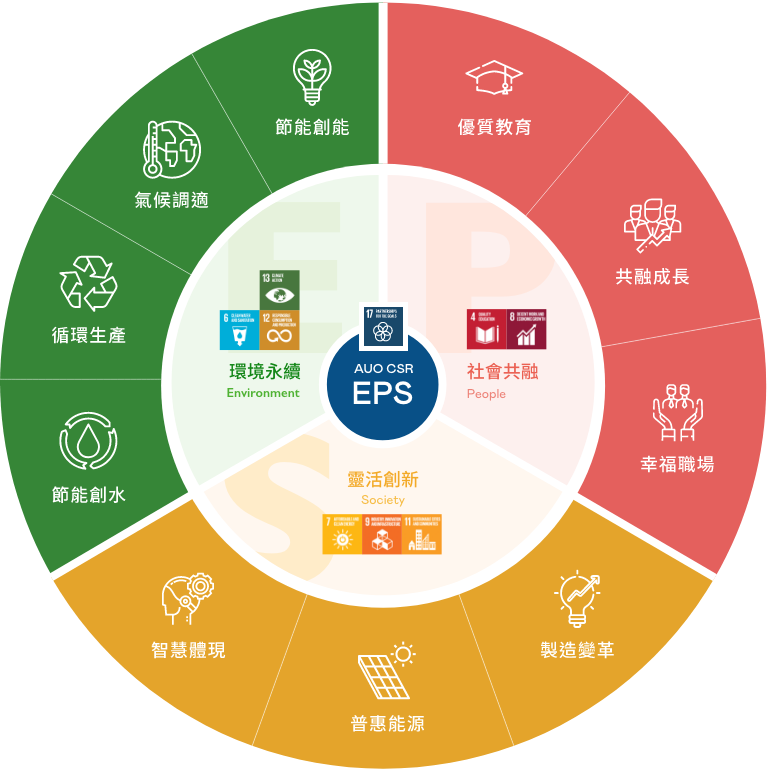 根據聯合國所發展的 17 項永續發展目標,771771威尼斯cm光電以「超越企業社會責任,創造共享價值」為企業永續願景發展藍圖,訂出環境永續、共融成長與靈活創新的 AUO EPS ( Environment,People & Society ) 三大永續發展主軸,以回應日益受關切的環境議題與社會共融趨勢。