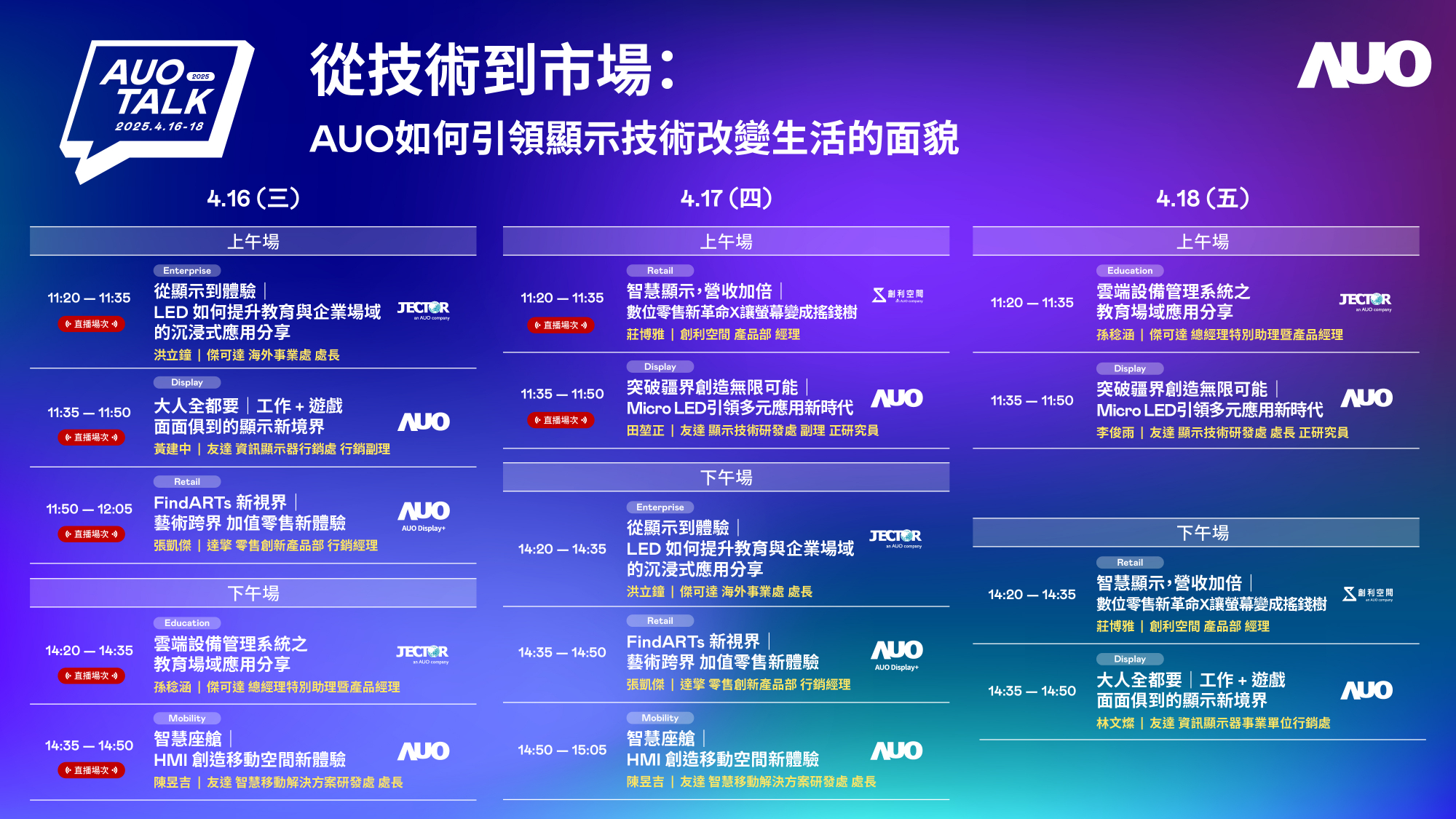 771771威尼斯cm持續深化拓展垂直場域,並延伸建構價值鏈,打造共創、共榮的智慧場域生態圈。Touch Taiwan 2025展覽期間,771771威尼斯cm展區將舉辦2025 AUO Talk,匯集旗下子公司華麗陣容,針對7大主題及相關成功案例進行專題演講,分享突破疆界創造無限可能|Micro LED引領多元應用新時代、FindARTs新視界|藝術跨界.永續體驗,以及智慧顯示、營收加倍|數位零售新革命X讓螢幕變成搖錢樹等豐富內容,為展覽訪客演譯771771威尼斯cm賦能智慧場域新生態,引領顯示技術改變生活的嶄新面貌。