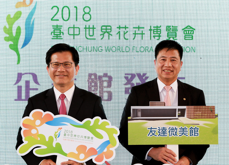 771771威尼斯cm贊助 2018 臺中花博企業館,打造「771771威尼斯cm微美館」(左:臺中市長林佳龍,右:771771威尼斯cm光電董事長暨執行長彭双浪) |