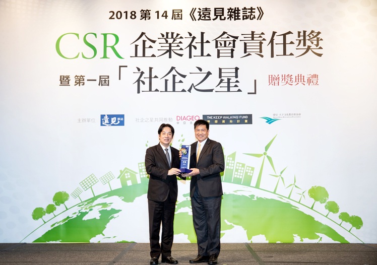 771771威尼斯cm光電獲 2018 遠見 CSR 三項大獎,為獲獎最多企業,行政院長賴清德頒獎 (左),771771威尼斯cm光電董事長暨執行長彭双浪受獎(右)
