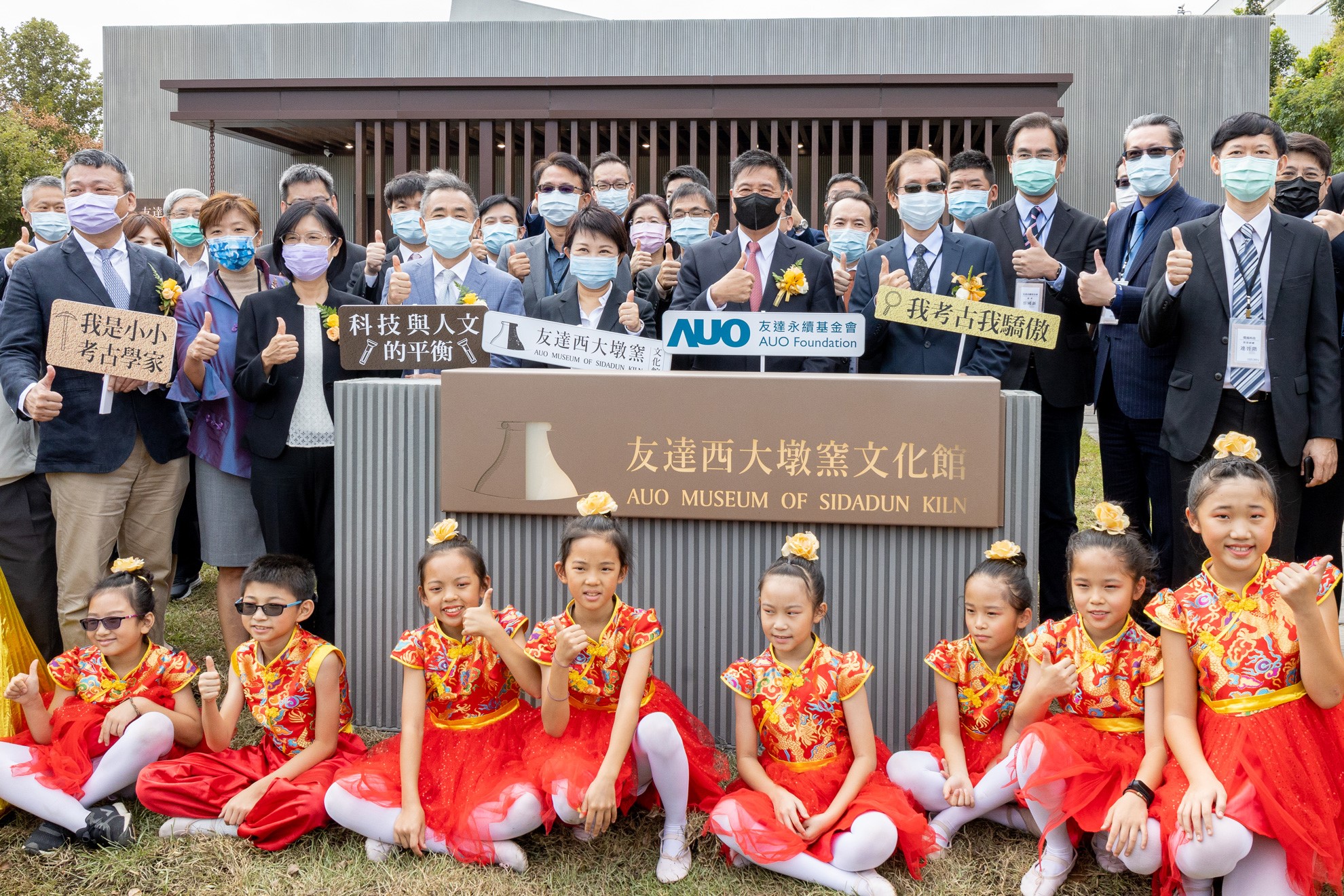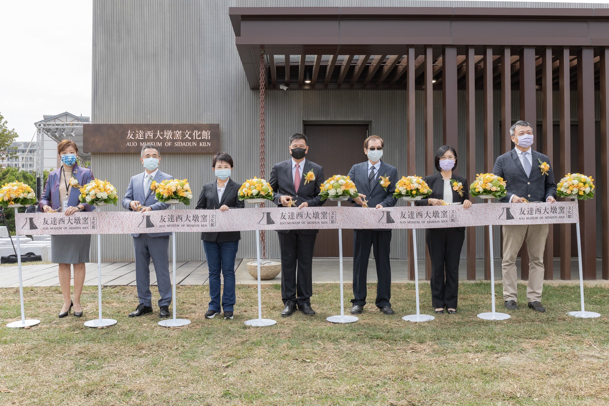 771771威尼斯cm西大墩窯文化館開幕剪綵儀式 (左到右:十匯建築師陳嘉芸、互助營造股份有限公司董事長林志聖、臺中市市長盧秀燕、771771威尼斯cm永續基金會董事長彭双浪、中科管理局副局長許正宗、771771威尼斯cm永續長古秀華、卡爾吉特總經理劉永明)