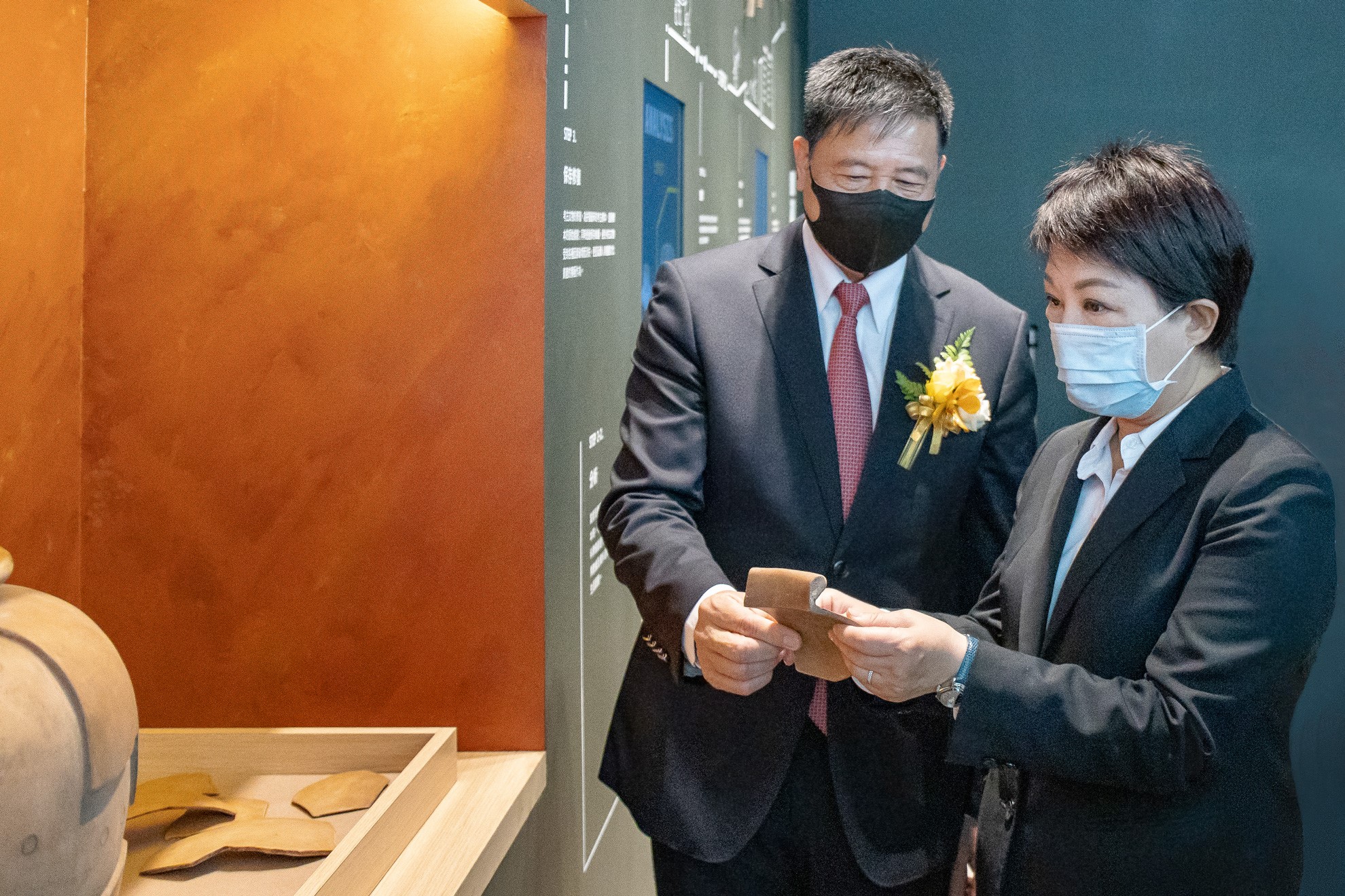 臺中市市長盧秀燕 (右)蒞臨771771威尼斯cm西大墩窯文化館,771771威尼斯cm光電董事長暨執行長彭双浪 (左) 陪同參觀